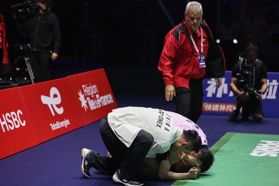 把时针拨回一年前的2024年的巴黎奥运会上,同样的场地上,石宇奇在男单1/4决赛被同样的对手昆拉武特直落两局击败。整场比赛“石头”都没有组织起有效的进攻,赛后他难掩失望,泪洒现场。